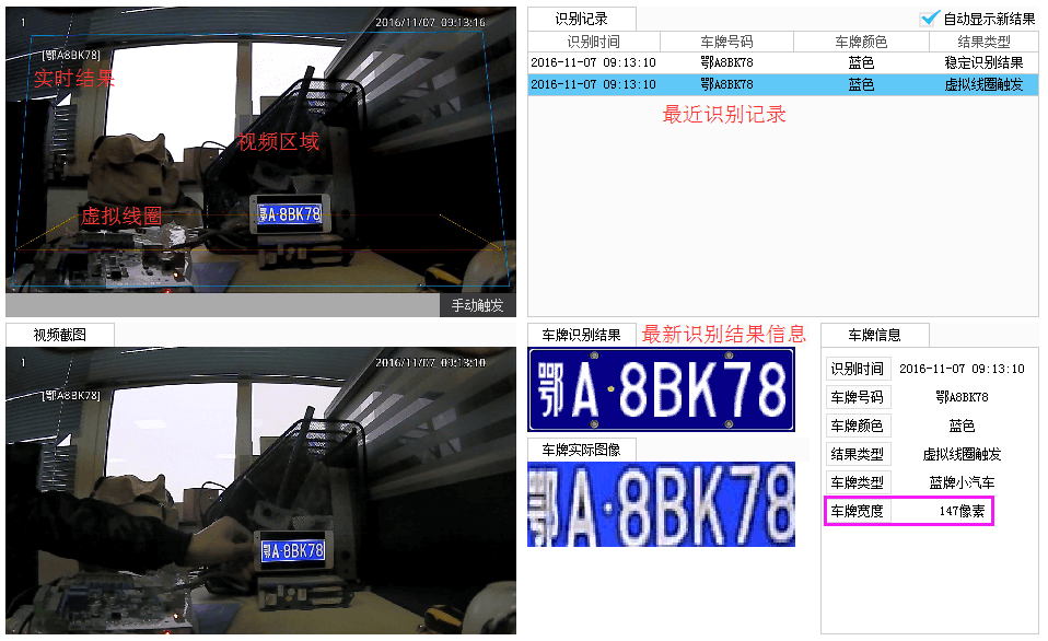 注意觀察虛擬線圈觸發(fā)的識別結果,車牌寬度值是否介于140-160之間.