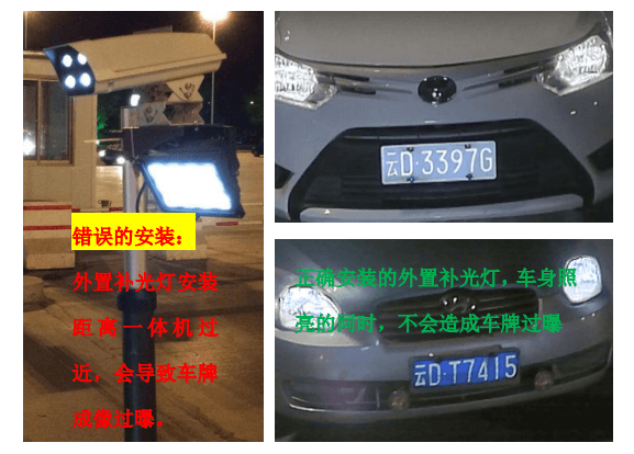 外置補光燈推薦采用白色LED補光燈,20~30W,聚光性質. 安裝高度要和攝像機保持在0.5米~0.7米的距離,外置補光燈的亮斑直接打在車牌或者車牌偏下一點,可以根據(jù)車牌過曝情況做微調,比如攝像機離地面高度1.6米,補光燈裝在同一根立柱0.9米~1.1米高; 注意:特別需要避免與以下外置補光燈錯誤的安裝情形: 外置補光燈與攝像機的安裝距離過近,如下圖,兩者的安裝距離小于30cm,補光燈的光線會直接被車牌表面的反光涂層反射到鏡頭,導致車牌在視頻圖像中過曝,顯得發(fā)白,影響 終的識別效果.